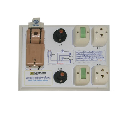 บอร์ดสำหรับศึกษาวงจรไฟฟ้าภายในบ้าน โดยมีสวิตช์ สำหรับเปิด-ปิด หลอดไฟและเต้าเสียบ 2 ชุด พร้อมสะพานไฟและฟิวส์ ขนาด 25×19 ซม.