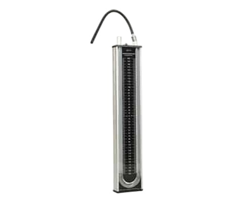 มาโนมิเตอร์ ท่อพลาสติกตัวยู ติดตั้งบนฐานและกรอบทำจากโลหะ แสดงสเกล 200-0-200 ในหน่วย มม. ปลายข้างหนึ่งมีสายยางสำหรับต่อเข้ากับอุปกรณ์อื่น