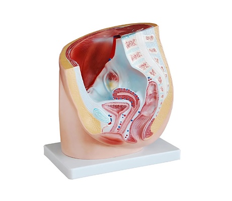 หุ่นจำลองย่อส่วนผ่าซีกแสดงโครงสร้างภายในอวัยวะเพศหญิง กระเพาะปัสสาวะ, ไส้ตรง, ช่องท้อง และกล้ามเนื้อเชิงกราน ขนาด 15×21.5×25 ซม. ทำจาก PVC