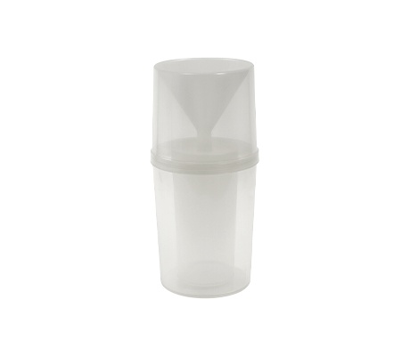 ทำจากพลาสติก ความสูง 24 ซม. ขนาดเส้นผ่านศูนย์กลาง 10 ซม. ภายในมีกระบอกวัดปริมาณน้ำฝนแบบละเอียด ความจุสูงสุด 50 มล.