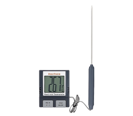 โพรบพร้อมลายวัดอุณหภูมิ ยาว 1.5 เมตร ของวัตถุหรือสารช่วง -50~200°C/-58~392°F เครื่องขนาด 60×75 มม. แสดงผลบนหน้าจอ LCD มีปุ่มบันทึกค่า