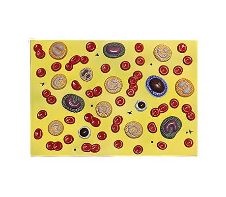 แบบจำลององค์ประกอบของเซลล์เม็ดเลือด ขยาย 2,000 เท่าของจริง ขนาด 50x35x6 ซม. แสดงเกล็ดเลือด, เม็ดเลือดแดง และเม็ดเลือดขาว