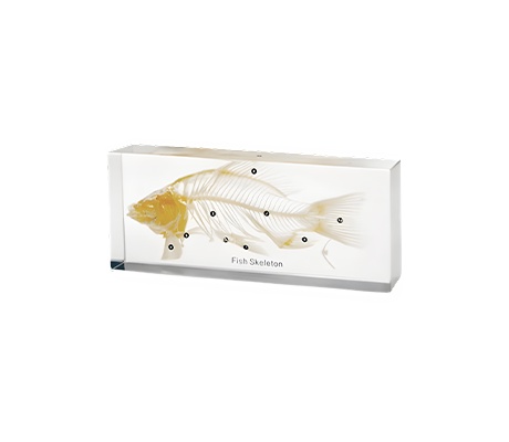 โครงกระดูกปลาเท่าจริงบรรจุในเรซิ่นใส แสดงรายละเอียดโครงสร้างภายใน ขนาด 20×9×4 ซม. พร้อมตัวเลขกำกับส่วนประกอบต่างๆ